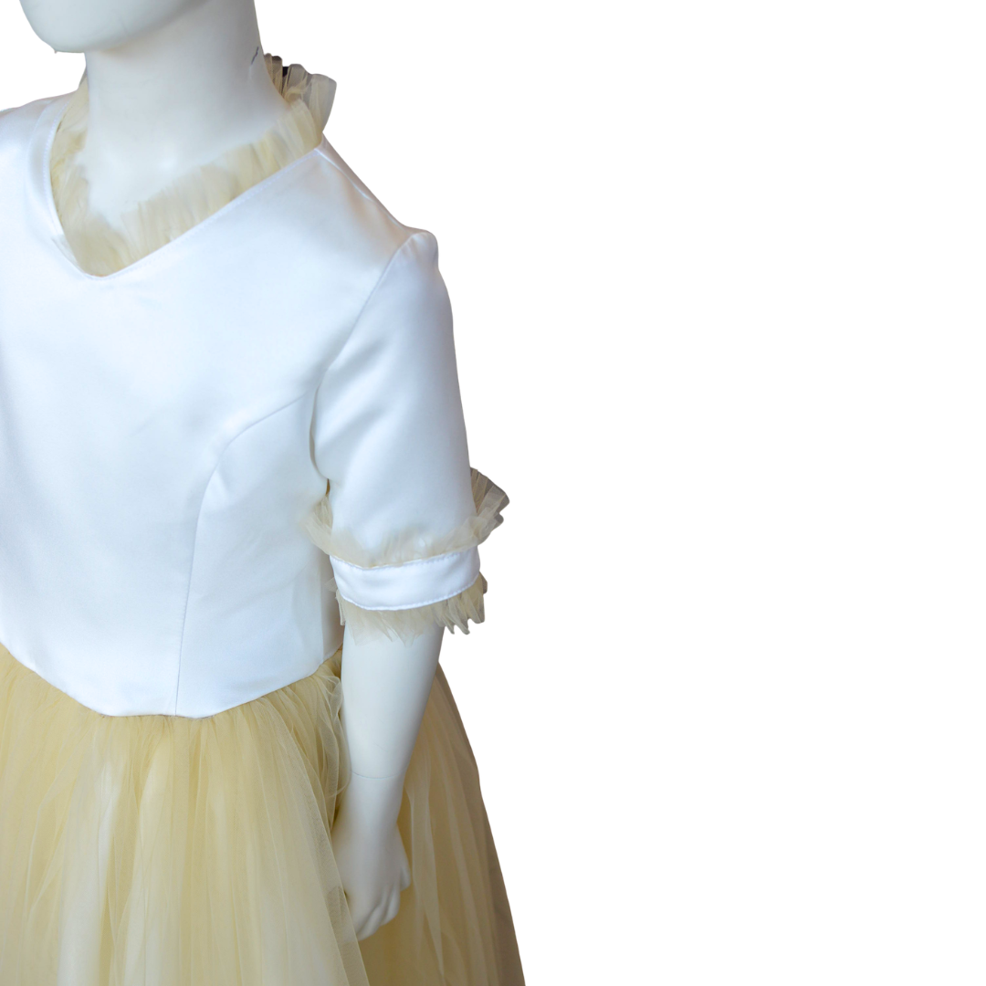 Raso Duchesse e tulle morbido, cerchietto con tulle. Possibilità di produzione sulle vostre misure.