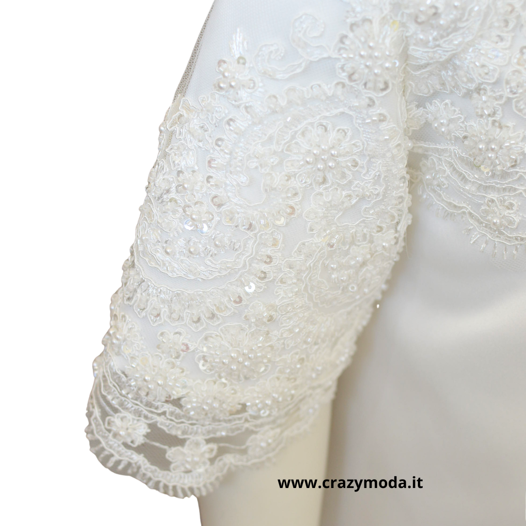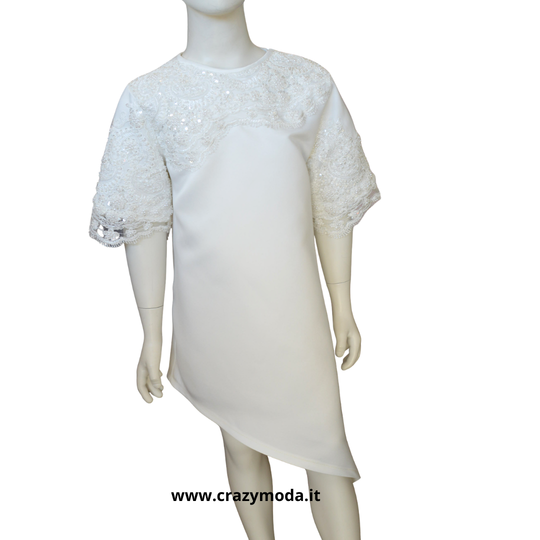 Abito modello asimmetrico in Raso Duchesse e pizzo con perline, apertura sulla spalla con automatici