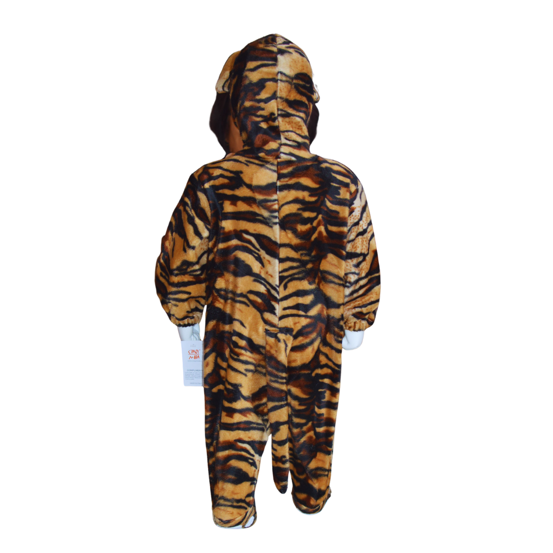 Tutina in ciniglia stampa tigre elasticizzata, coda e piede coperto. Cuffia con orecchie.
