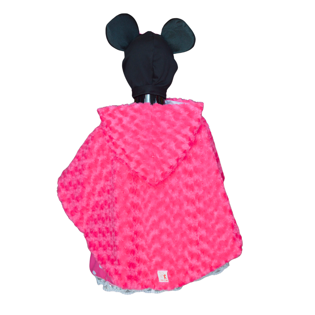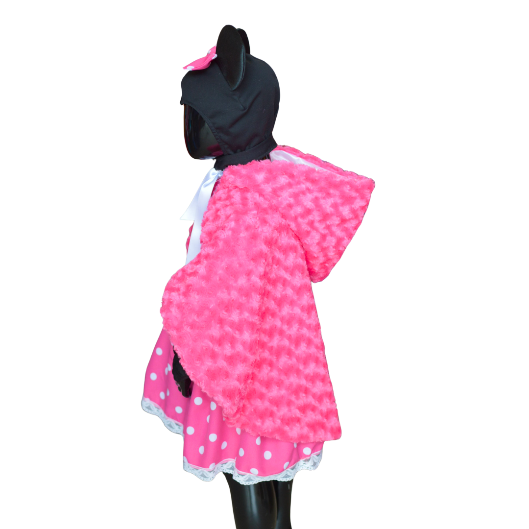 CARATTERISTICHE: Abito in tessuto fuxia a pois bianco, gonna arricciata con pizzo in fondo, manica lunga a palloncino, sottogonna in tulle nero, cinta con fiocco, cuffia in felpa con orecchie in spugnetta e fiocco. mantella con cappuccio in pelliccia e fodera raso