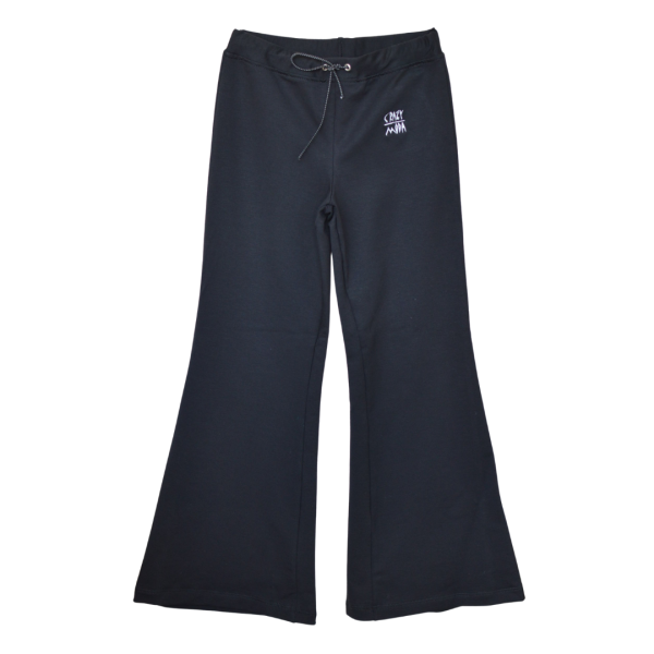 Felpa nera leggera ed elasticizzata, gamba a zampa, in vita elastico e coulisse.